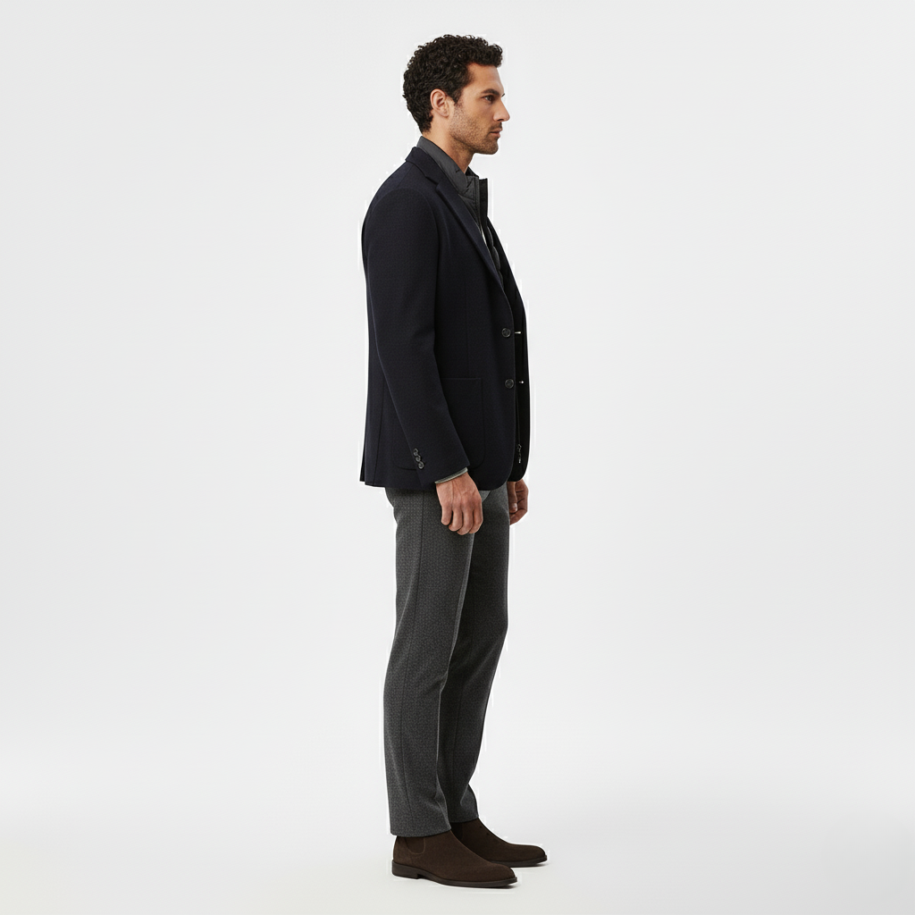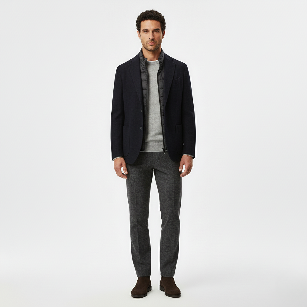 Opgrader din vintergarderobe med denne forhøjede kombination, der består af en marineblå blazer, grå quiltet vest, lysegrå sweater og grå skræddersyede bukser. De lagdelte neutrale toner skaber dybde, mens de bevarer et rent og alsidigt look perfekt til arbejde, rejser eller poleret hverdagsstil. Designet til varme, komfort og moderne herreinspireret æstetik leverer dette outfit en afbalanceret kombination af struktur og lethed.