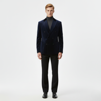 Løft din formelle garderobe med denne raffinerede kombination, der består af en marineblå velourblazer, kulsorte rullekrave og sorte skræddersyede bukser. Blandingen af dybe toner og luksuriøse teksturer skaber et poleret, moderne look, der er ideelt til aftener ude, særlige begivenheder eller forhøjede arbejdssituationer. Designet til komfort og raffineret stil giver dette ensemble tidløs elegance med moderne menswear-æstetik.